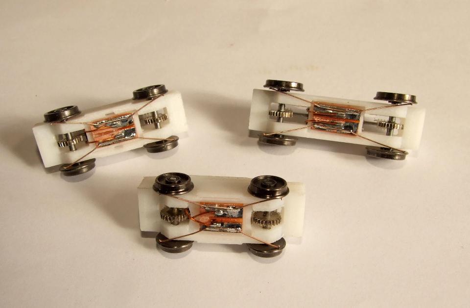 They were different wheelbases and different body fixings, otherwise the same wheels, gears and motors, gearing 33:1 with 13:1 gear sets and a 2.5:1 O ring drve from the motor. The wiring at the motor end is to connect to a 4 part pcb for DCC chip connection.