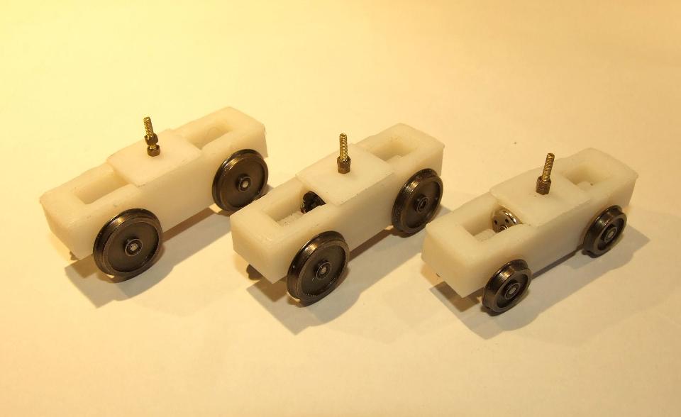 I made this pair for an HO tram and made central pivots to mount them, I can do this to order. When wired together they run faultlessly and could pull a train of at least 10 coaches. I can make these with wheelbases from 22mm to around 35mm.